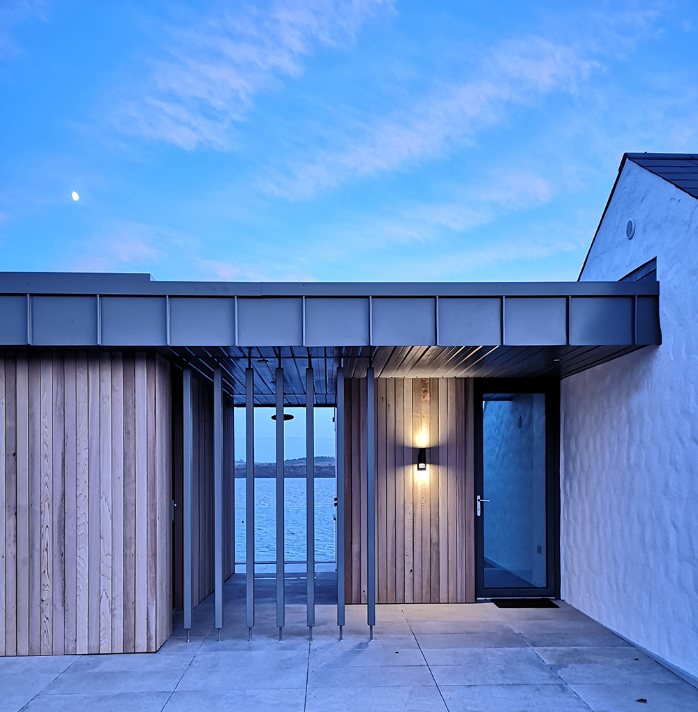 If we forget about the building for a moment, ultimately An Cúlú is about the site in which it sits and its emotional connection with the client – the architecture is there to capture that and a sense of place. You are drawn to appreciate this unique place because it is almost impossible not to connect with the natural environment here. The existing house has a strong solid to void ratio with small modest vertical emphasis windows, the new extension has an expanse of glazing that strikes a perfect balance between inside and out, whichever way you look. An Cúlú takes the homeowners on a journey, arriving on the humble north side of the house, moving through a series of small and intimate spaces to arrive in to the bright open – plan extension and be fully immersed in the seascape. A curved wall wrapped in timber adds intrigue and drama as the seascape reveals itself. The spaces in the original house become the bedrooms and the extended floor area is given over to living spaces overlooking Inver Bay.
