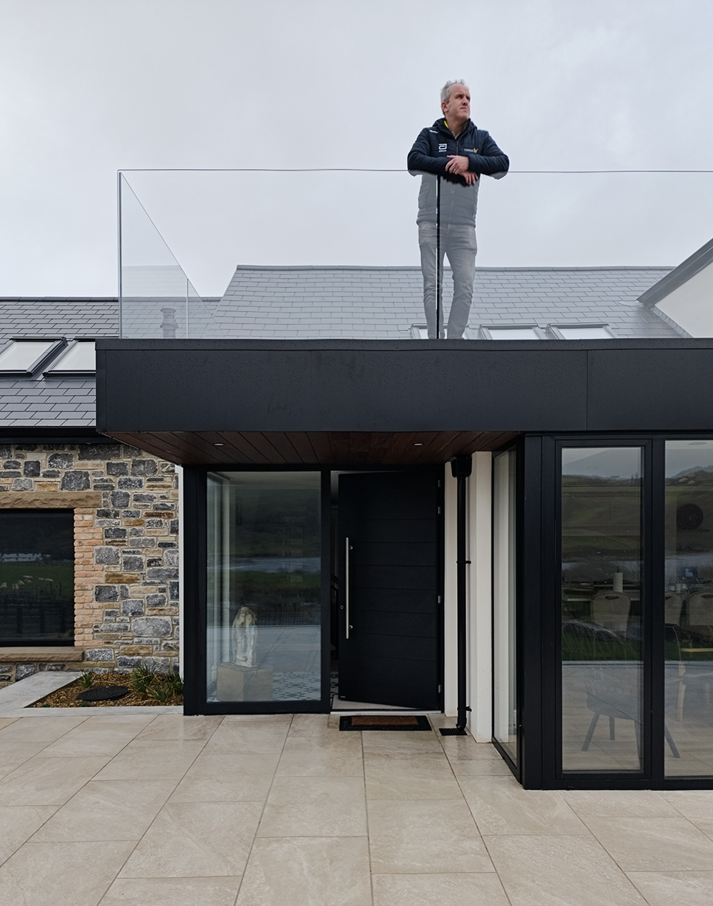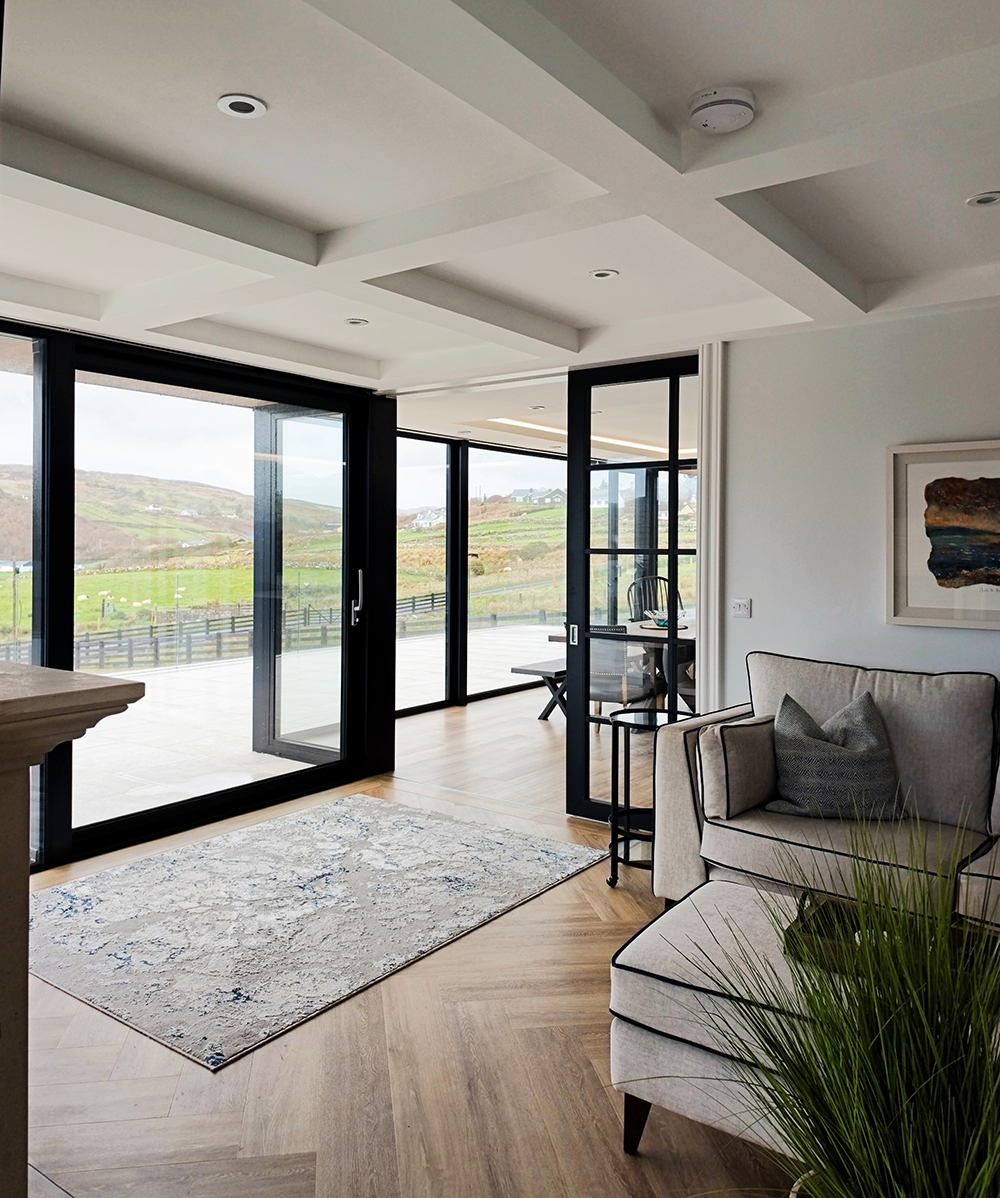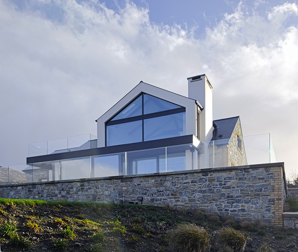 A carefully considered palette of high-quality materials, including natural stone, smooth render, dark-framed glazing, and slate roofing, which reference the local vernacular while expressing a refined contemporary aesthetic. The extensive use of glazing allows for abundant natural light into the dwelling and creates a strong visual and functional connection between internal living spaces and the surrounding landscape of Kilcar.